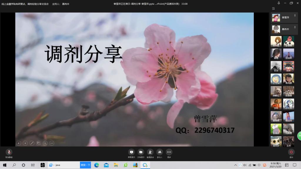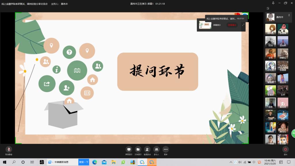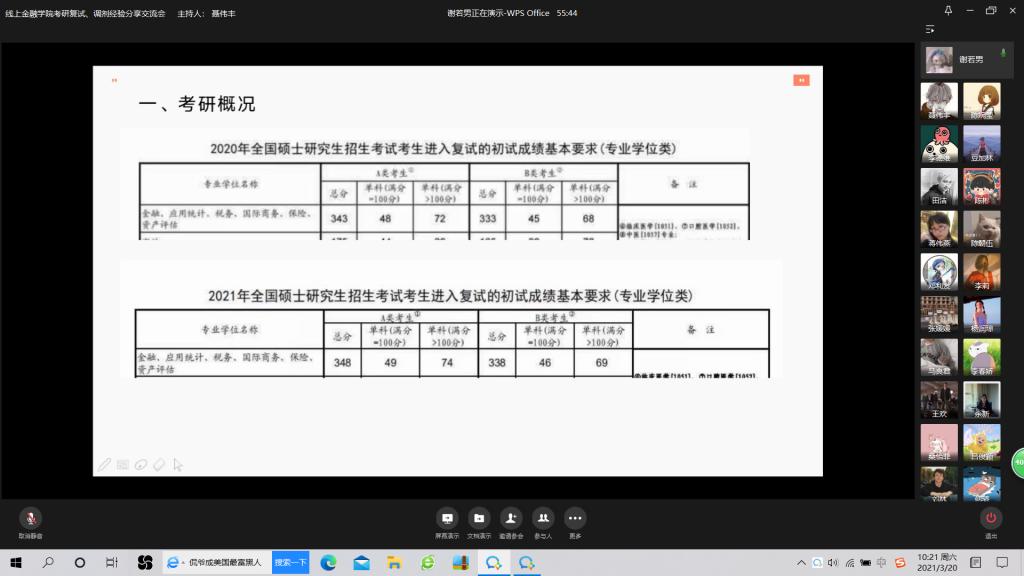 3月20日上午9:30,伟德国际1946成功举行了“伟德国际1946考研复试、调剂经验分享”线上交流会。此次交流会邀请了2020届考研成功的五位员工:杨润琼、陈朝伍、曾雪萍、刘柯岚、谢若男来分享关于复试和调剂成功的相关经验,为同学们答疑解惑。金融公司党委书记、副经理王建明,党委副书记、纪委书记余新出席了本次交流会。