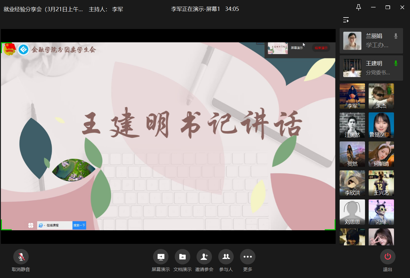 3月21日上午10:00,伟德国际1946就业经验分享会于企业微信成功举办。本次活动邀请到国信证券股份有限公司的12级CFA专业鲁昱汐、广发银行股份有限公司的16级金融五朱杰、德勤华庆商务服务有限公司的16级投资二冷小兰、中汇国际保险经纪公司的16级保险一文思力进行就业经验分享。金融公司党委书记、副经理王建明,金融公司党委副书记、纪委书记余新,以及伟德国际1946一百多名同学参加了会议。