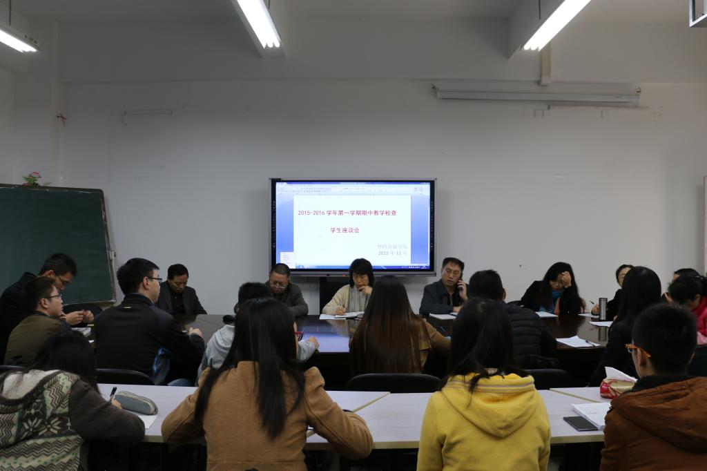 11月25日,财政伟德国际19462015-2016学年第一学期期中教学检查员工座谈会于田家炳书院313会议室召开。财金公司党总支书记杨萍、常务副经理莫云、校督导督查委员樊国昌教授、院督导督查委员周渊老师和唐晓玲老师;还有各系主任及教务办全体老师和各班学习委员出席座谈会。