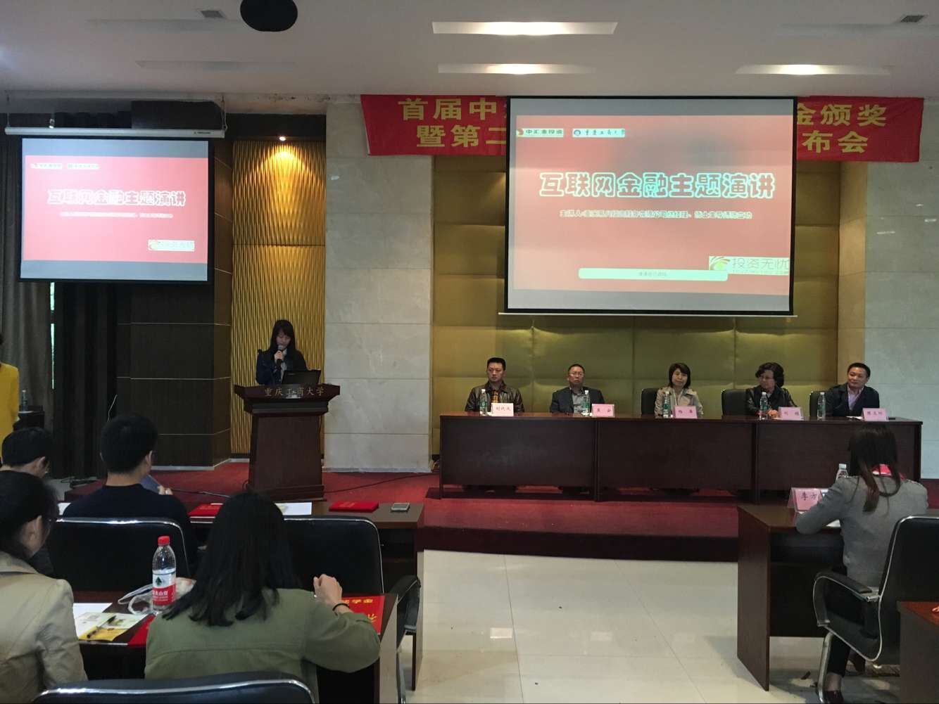获奖员工代表在发言中对中汇金投资管理有限公司提供社会实践平台表示感谢,同时也向大家分享在社会实践行业调研活动中的经验。重庆易八投资服务有限公司陈总在颁奖典礼结束后为财金学子带来了“互联网金融知识”专题讲座,讲座紧贴当前“互联网+”的大背景,从互联网支付到互联网金融风险,从发展现状到前景预测,专业的知识分析让在场员工对互联网金融知识有了更为透彻的理解。