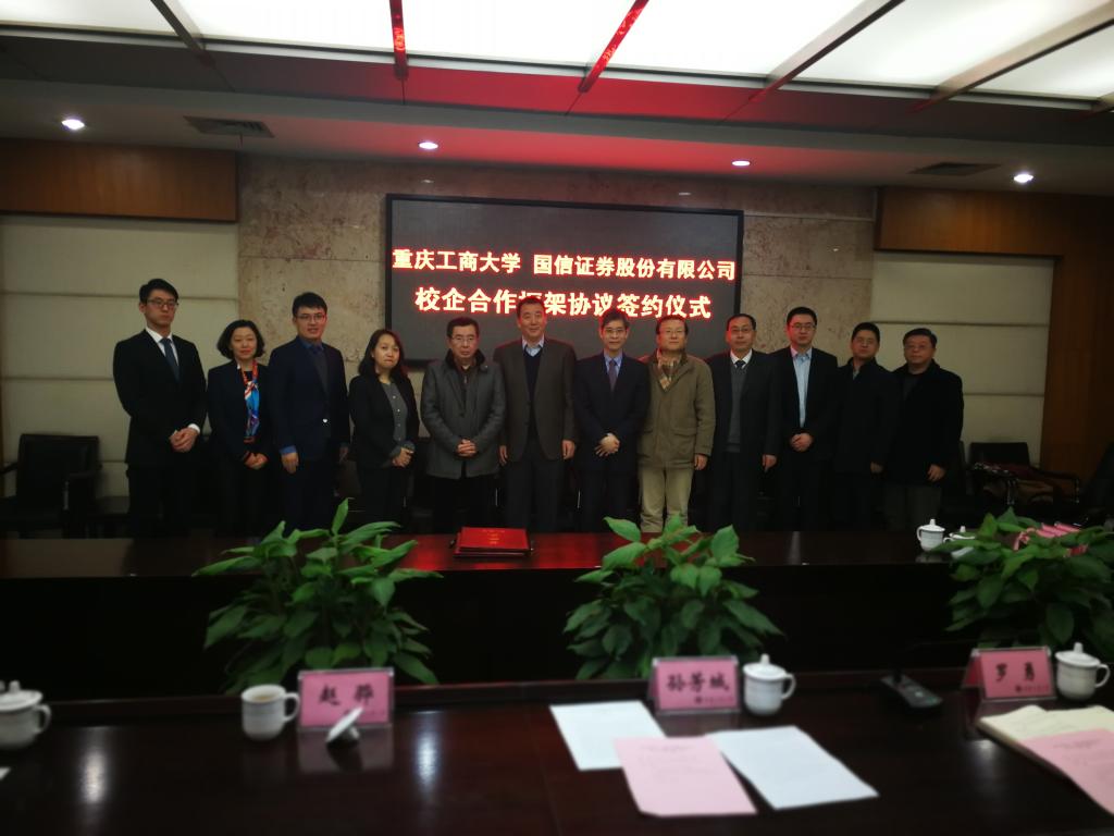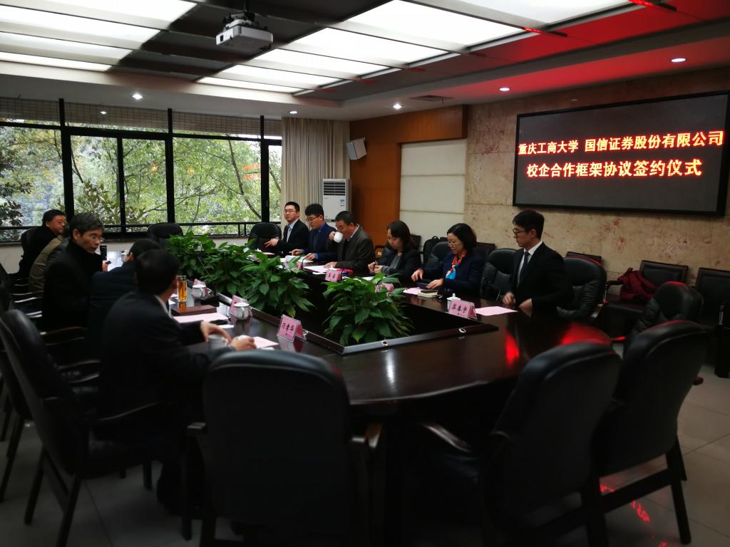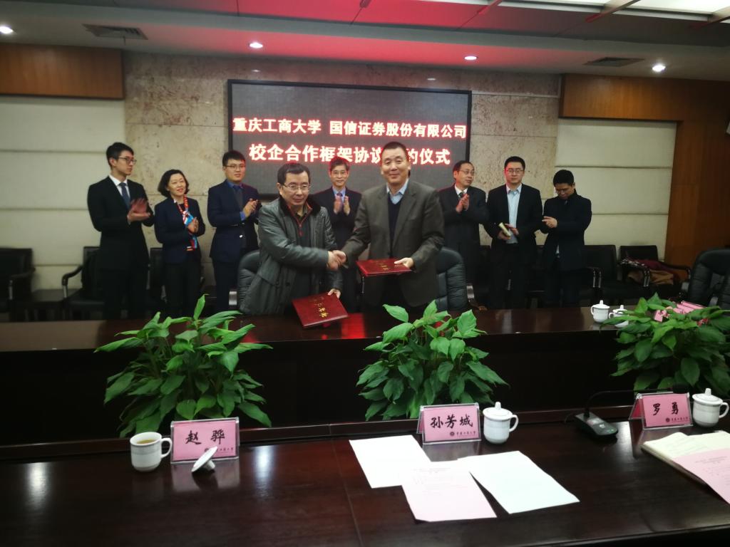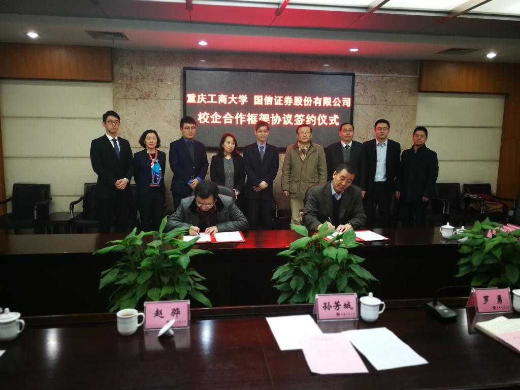 1月18日下午,为加快贯彻落实《重庆市以大数据智能化为引领的创新驱动发展战略行动计划(2018-2020年)》等文件精神,重庆工商大学与国信证券股份有限公司在厚德楼3019会议室签订战略合作协议。国信证券股份有限公司副总裁徐敬耀、投研总监陈俊杰、重庆分公司总经理高莉、总经理助理李颖、业管部负责人陈哲,公司董事长孙芳城教授、副董事长赵骅教授、党政办、教务处以及财政伟德国际1946主要负责人出席了签约仪式。仪式由公司党政办主任罗勇教授主持。