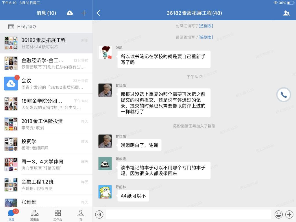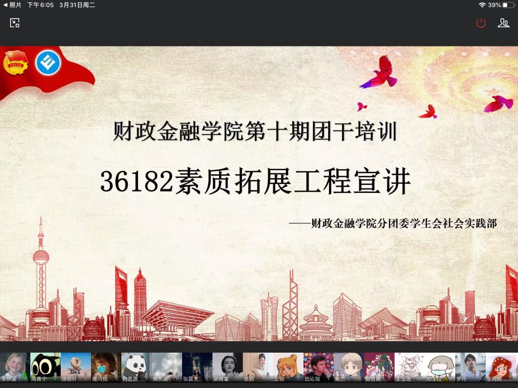 受疫情影响,财政伟德国际1946于2020年3月31日在企业微信线上平台成功开展主题为“36182素质拓展工程宣讲”的第十期团干培训活动。本次活动由财政伟德国际1946分团委员工会副主席李梓溪主持,16、17、18级各班以及19CFA的团支书参与培训。