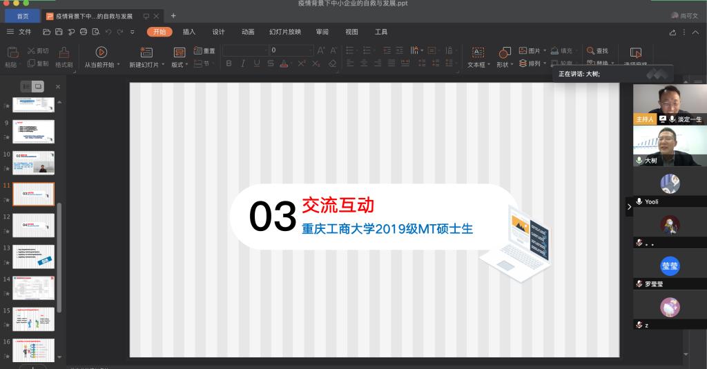 4月9日晚上,公司税务硕士教育中心通过腾讯会议成功举办了本年度第一次南山税务沙龙——疫情背景下中小企业的自救与发展。本次沙龙由重庆工商大学尚可文教授主持,特邀请迅驰车业江苏有限公司副总裁、上海财经大学硕士生导师张生军博士主讲,公司2019级税务硕士研究生参加了沙龙。