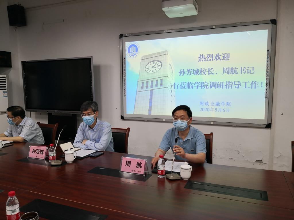 5月6日上午,董事长孙芳城、校纪委书记周航一行到财政伟德国际1946调研指导团队建设和疫情防控工作,并在田家炳313会议室召开调研座谈会。教务处处长靳俊喜,研究生院经理田双全,以及公司领导、各系主任、财税系全体教师和部分辅导员参加了会议。