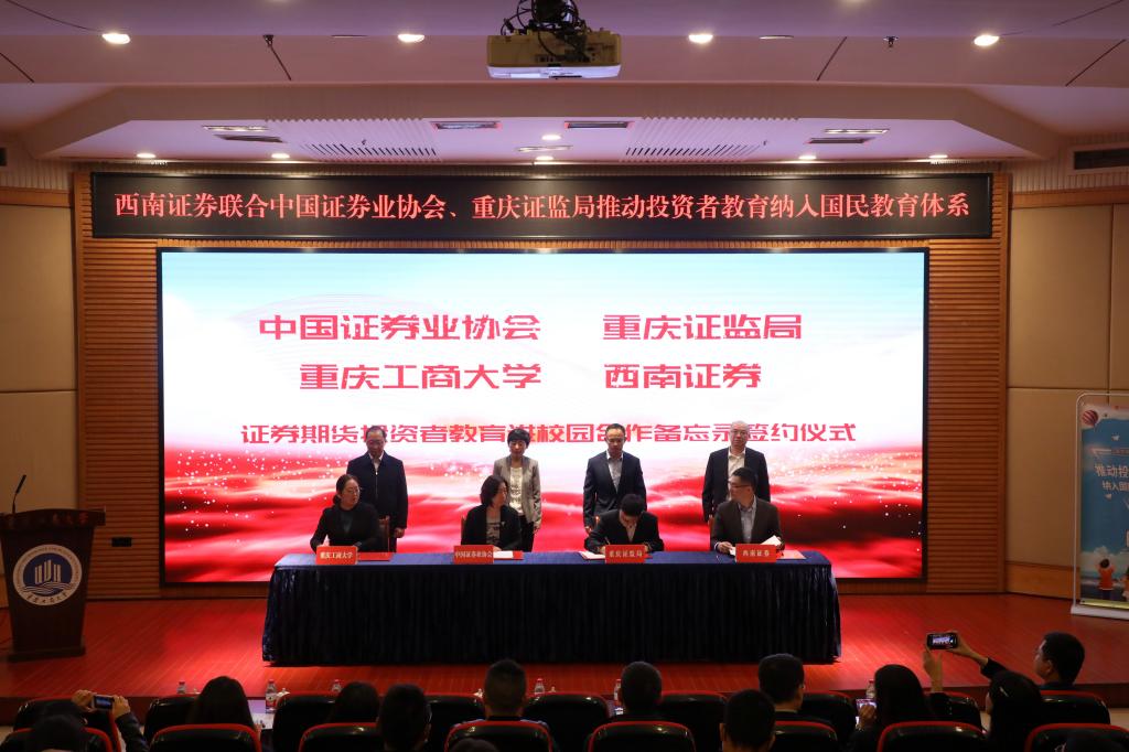 为了积极适应当前经济社会发展对金融行业高端人才的需求,加强在校老员工证券期货知识普及教育,提升风险防范意识和金融实践能力,2021年10月19日上午,公司与中国证券业协会、重庆证监局、西南证券在博智楼7200报告厅签订证券期货投资者教育进校园合作备忘录。中国证券业协会党委委员、副会长张冀华,重庆证监局党委委员、副局长郑松山,西南证券股份有限公司党委委员、副总裁李勇,重庆工商大学党委常委、副董事长张波出席签约仪式。中国证券业协会投资者服务部研究员周素霞,重庆证监局调研员周峰,西南证券董事会秘书、经纪业务事业部执行总裁李军,金融公司党委副书记、经理王兰代表四方签约。北京证券交易所、中国结算北京分公司、重庆市证券期货业协会、西南证券股份有限公司等单位代表和公司国内合作发展处 、伟德国际1946部分师生100余人参加了签约仪式。