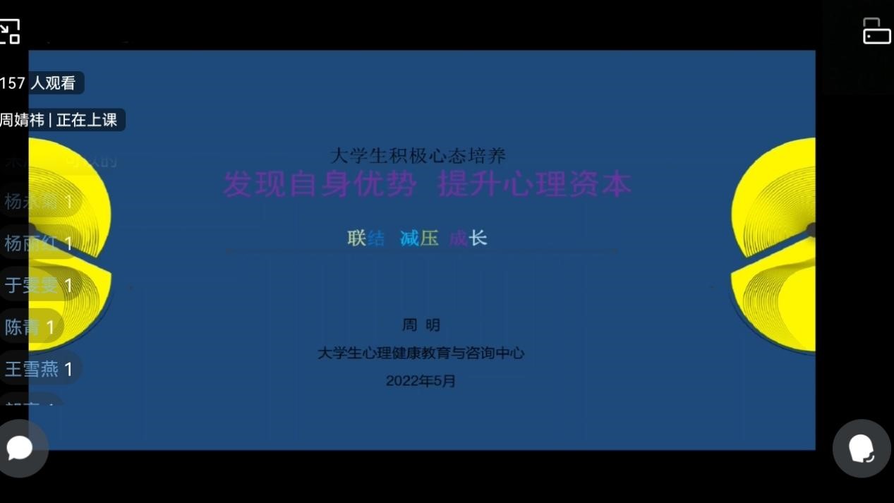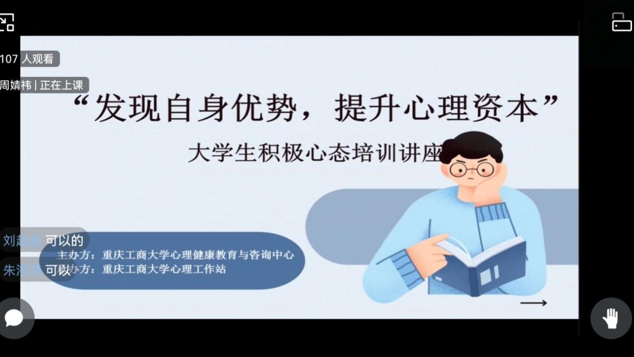 2022年5月25日中午12点,由重庆工商大学心理健康教育与咨询中心主办,伟德国际1946心理工作站承办的“发现自身优势,提升心理资本”心理培训讲座于企业微信线上平台顺利举办。此次讲座邀请到了公司心理健康教育与咨询中心周明老师作为主讲人,讲座内容丰富、寓教于乐,受到了同学们的热烈欢迎。