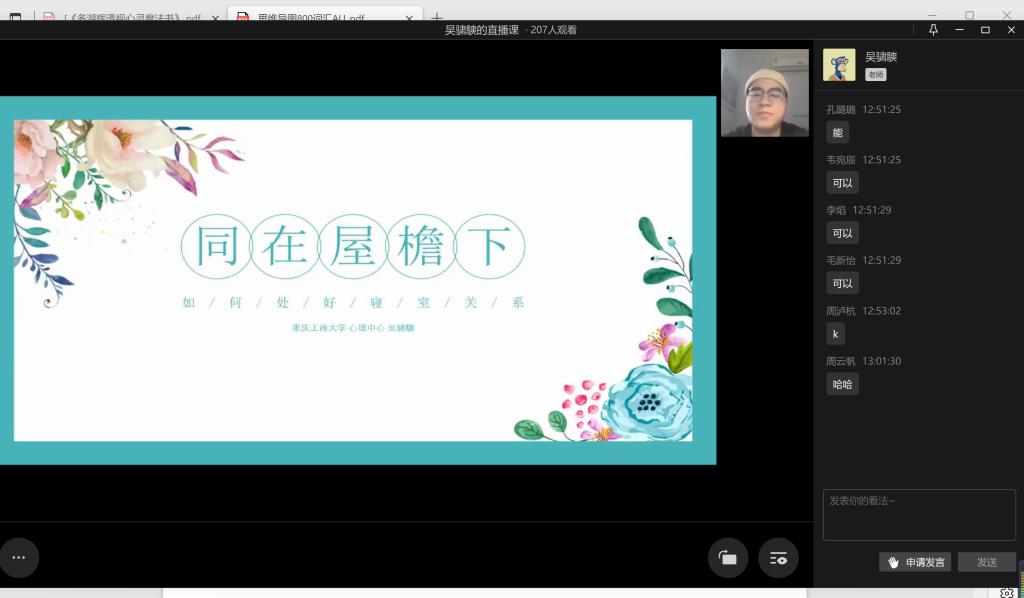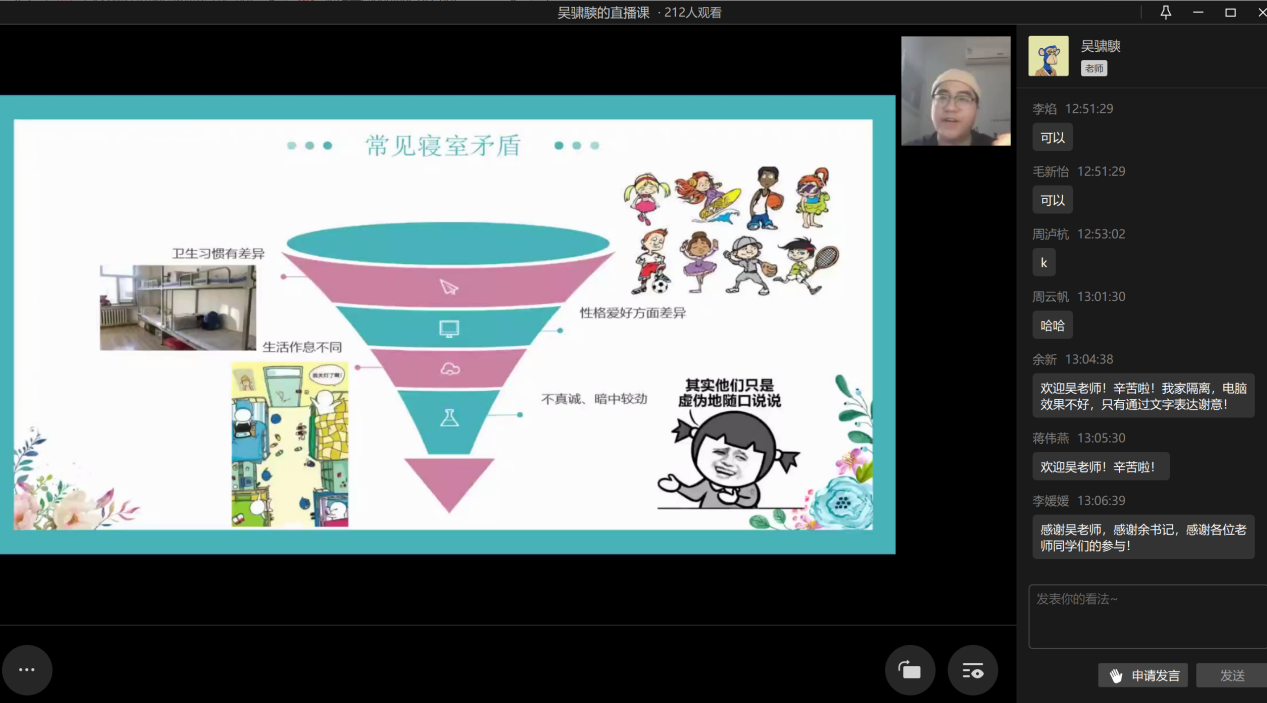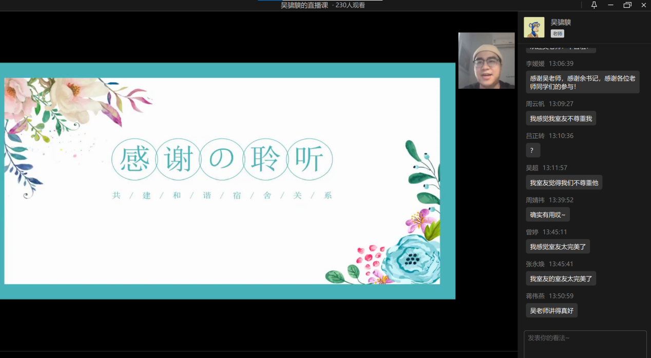 2022年11月11日中午13点,伟德国际1946心理工作站主办的“同在屋檐下——和谐寝室关系”心理讲座于企业微信线上平台顺利举办。此次讲座邀请到了公司心理健康教育与咨询中心吴骕騻老师作为主讲人,讲座内容丰富、寓教于乐,受到了同学们的热烈欢迎。