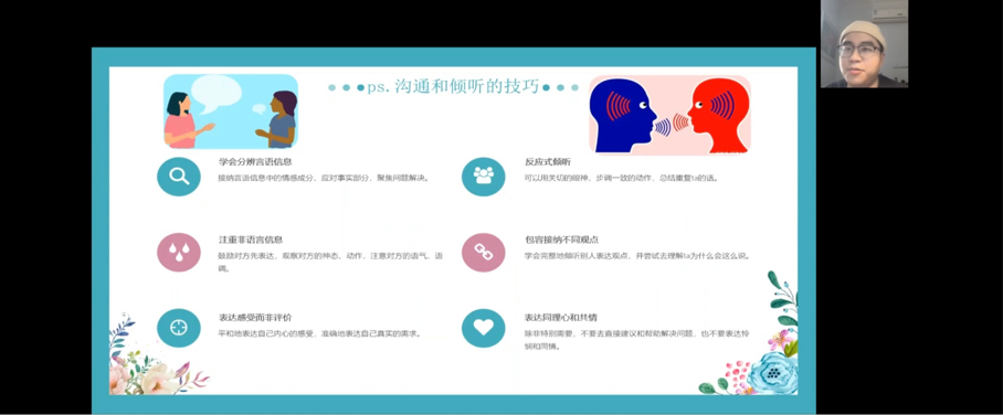 活动伊始,金融公司党委副书记余新对讲座给出了良好祝愿,并高度肯定了此次活动的意义。之后由吴骕騻老师进行了精彩讲座,他凭借自己深厚的学术知识和丰富的心理学实践经验,从常见寝室矛盾和寝室相处的重要原则等方面为在场同学们进行了深入浅出的讲解。此外,吴老师还结合真实案例拓展了“人际交往当中的沟通和倾听技巧”等有关老员工心理成长的知识,同学们收获颇丰。
