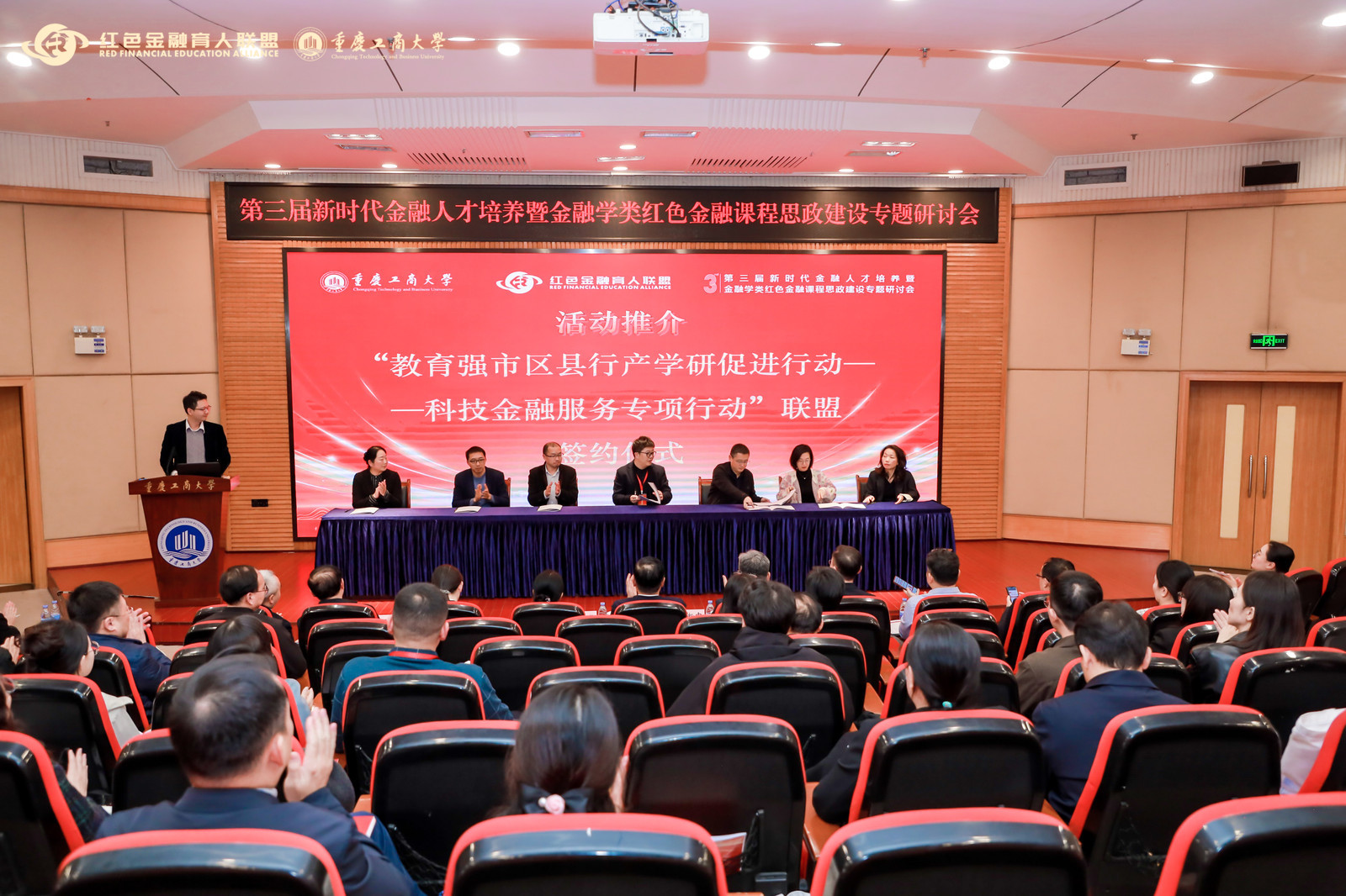 10月16日,为深入贯彻国家创新驱动发展战略,推动创新链、产业链、资金链、人才链深度融合,积极响应重庆市“教育强市区县行”产学研促进行动部署,由重庆工商大学牵头,联合西南大学、西南政法大学、重庆师范大学、重庆理工大学、重庆财经公司、重庆建筑工程专业公司等7所在渝高校,并汇聚金融机构等多领域专家,共同发起成立“‘科技金融服务专项行动’在渝协作联盟”在重庆工商大学、北京联合大学主办的“第三届新时代金融人才培养暨金融学类红色金融课程思政建设专题研讨会”上进行推介签约,并正式发布行动宣言,开启在渝高校科技金融协同创新新篇章。