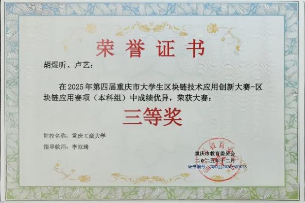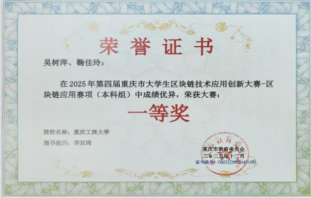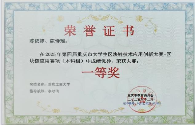 本次比赛设有“区块链技术组”与“区块链应用组”两个赛道。在赛事前期,经过前期校内选拔,公司伟德国际19468名同学脱颖而出,晋级市级区块链应用组决赛。在激烈竞争中,同学们发挥出色,最终取得优异成绩:陈依婷、陈诗瑶、吴树萍、鞠佳玲4位同学获一等奖,宁曼伊、唐秋月2位同学获二等奖,胡煜昕、卢艺2位同学获三等奖;指导老师李双琦被授予“突出贡献个人”称号;重庆工商大学荣获“突出贡献集体”。