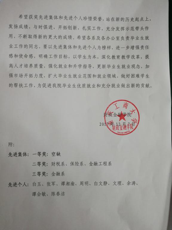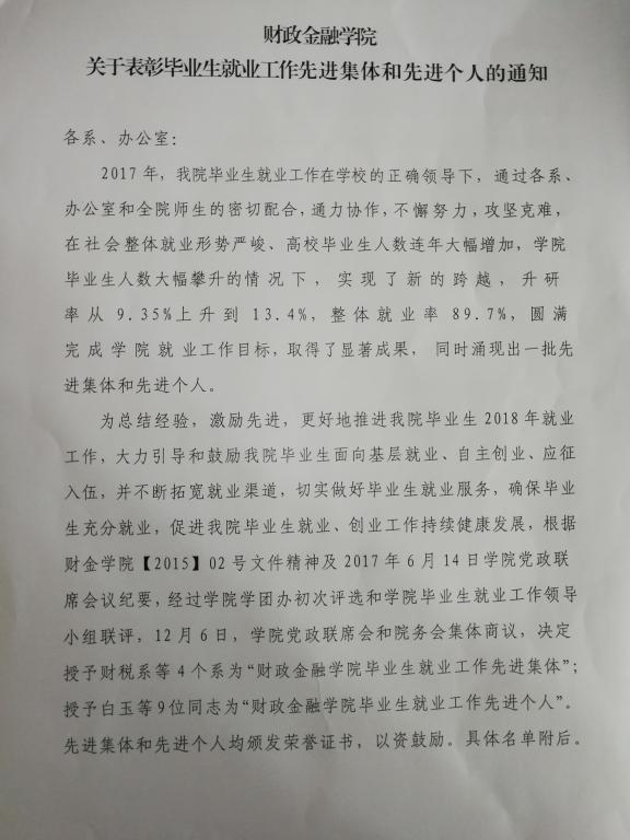 为总结经验,激励先进,更好地推进公司毕业生2018年就业工作,大力引导和鼓励公司毕业生面向基层就业、自主创业、应征入伍,并不断拓宽就业渠道,切实做好毕业生就业服务,确保毕业生充分就业,促进公司毕业生就业、创业工作持续健康发展,根据财金公司【2015】02号文件精神及2017年6月14日公司党政联席会议纪要,经过公司学团办初次评选和公司毕业生就业工作领导小组联评,12月6日,公司党政联席会和信息会集体商议,决定授予财税系等4个系为“财政伟德国际1946毕业生就业工作先进集体”;授予白玉等9位同志为“财政伟德国际1946毕业生就业工作先进个人”。先进集体和先进个人均颁发荣誉证书,以资鼓励。具体名单附后。
