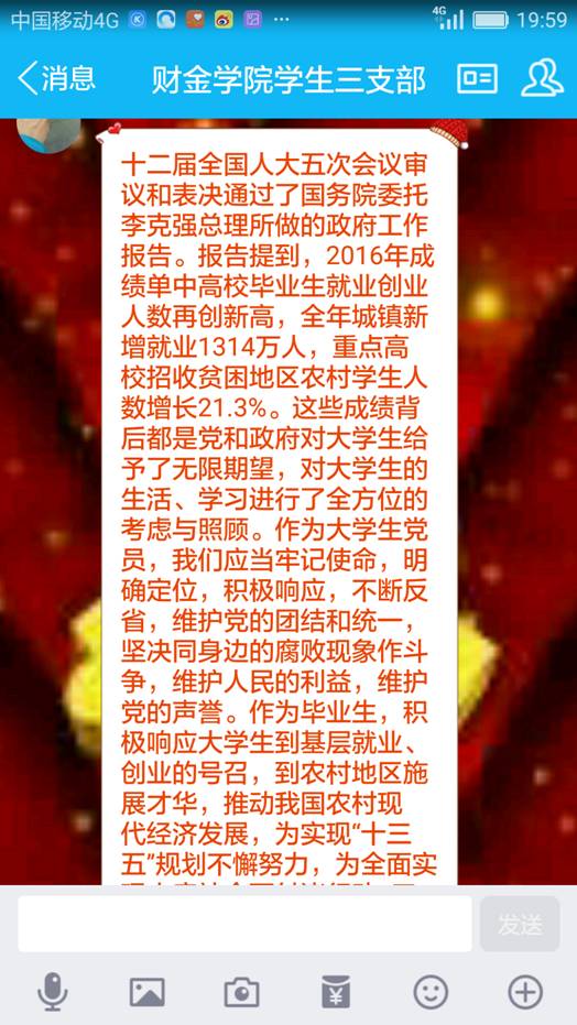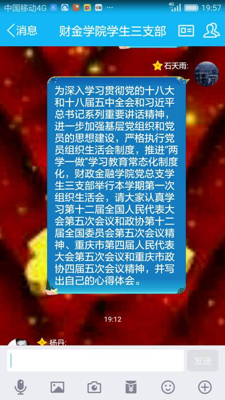 本次组织生活会以线上方式进行,2017年3月31日晚7点,财政伟德国际1946员工三支部的同志们准时聚集在QQ群上。石天雨同志主持了本次会议,他首先上传了本次会议内容,包括了第十二届全国人民代表大会第五次会议和政协第十二届全国委员会第五次会议精神、重庆市第四届人民代表大会第五次会议和重庆市政协四届五次会议精神有关的文件让大家学习并发表自己的观点。