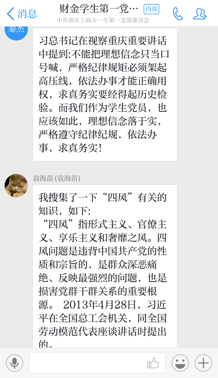 2019年2月18日,财金员工第一党支部组织全体党员进行了寒假第二次交流学习。本次学习由赵利国同志主持,支部全体党员同志参与。交流学习内容包括:1.学习习近平总书记视察重庆重要讲话、习近平总书记参加重庆代表团审议时重要讲话以及习近平总书记关于进一步纠正“四风”、加强作风建设的重要指示等精神2.由黄丽媛同志分享并简单介绍热点新闻:“国家发文!一大批普通本科高等公司将向应用型转变”。