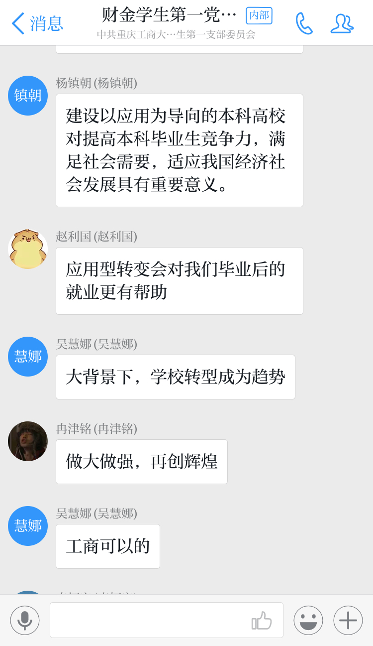 其次,党员同志就大批普通本科高等公司向应用型转变的热点新闻展开热烈讨论,同志们纷纷表示这一举措不仅有利于一大批高校的特色化发展,还有利于为国家建设输送更多的高技能人才,除此之外,同志们均表达了对重庆工商大学的美好期盼与信心,同时表示自身也应踏实学习、学以致用,为公司和国家做出自身的贡献。