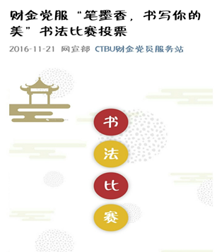 为了表达我们对党的热爱,学习习近平总书记的讲话,激发大生这一先进群体的爱国爱党热情,加强老员工群体的党性素养。也为了在我们员工群体引导提倡书写,用笔尖书写中华汉字之美,渲染一种文化氛围,充分调动员工群体参与活动的积极性,重庆工商大学财金公司党员服务站于2016年11月15日至12月9日举办了以“笔墨香,书写你的美”为主题的线上书法比赛活动。