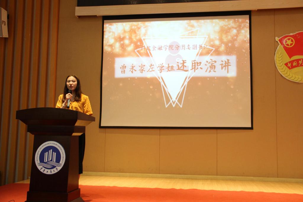 大会伊始,在场的分团委成员通过一段简短而又温馨的视频回顾了过去一年财金公司经历的点点滴滴。视频播放完毕后,财金公司分团委书记徐阔老师上台致辞,徐阔老师简短地总结了一年来的工作,对校运动会等重大活动中公司上下的表现进行表扬,并对财金公司未来的发展表示期待。接下来,财金公司分团委副书记曾永家左进行了述职演讲,一字一句中体现了对财金公司的热爱与对未来的美好展望。