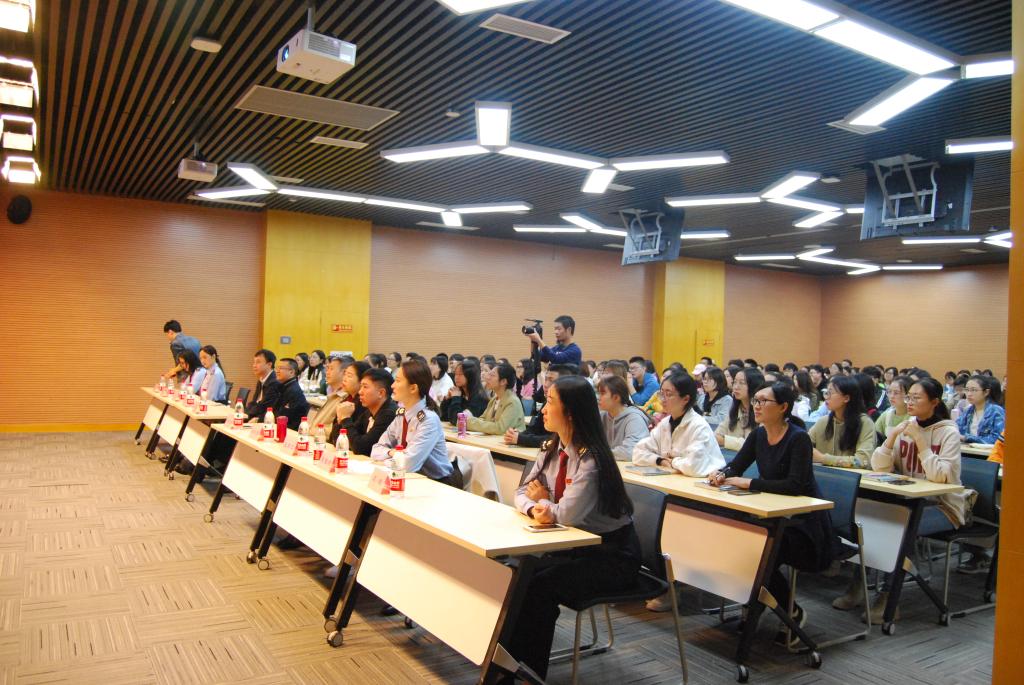 宣讲会开始后,韩健老师上台致辞。他引用孟子的话“徒善不足以为政,徒法不能以自行”,教导我们不仅要学习税法知识,更重要的是要培养税法思维,让税法思维融入到生活和工作中。随后重庆税收普法宣讲团成员、涪陵区税务局马晓敏老师和重庆税收普法宣讲团成员、重庆市第七稽查局何冰翊老师分别向同学们介绍了关于发票的“套路”和税务稽查的“前世今生”。何冰翊老师称: 纳税道路千万条,诚信纳税第一条;涉税行为不规范,亲人朋友两行泪。劝解同学们要诚信纳税。劳动模范、巴渝工匠、国家高级刺绣师、重庆税收志愿者单大琼老师为我们分享了她自己与税收有关的创业故事。我们的学姐、重庆工商大学优秀毕业生、南岸区税务局的宋雅洁也来到现场,与我们分享她在税务系统工作的感受。宣讲会在程羿老师致辞中落下帷幕。
