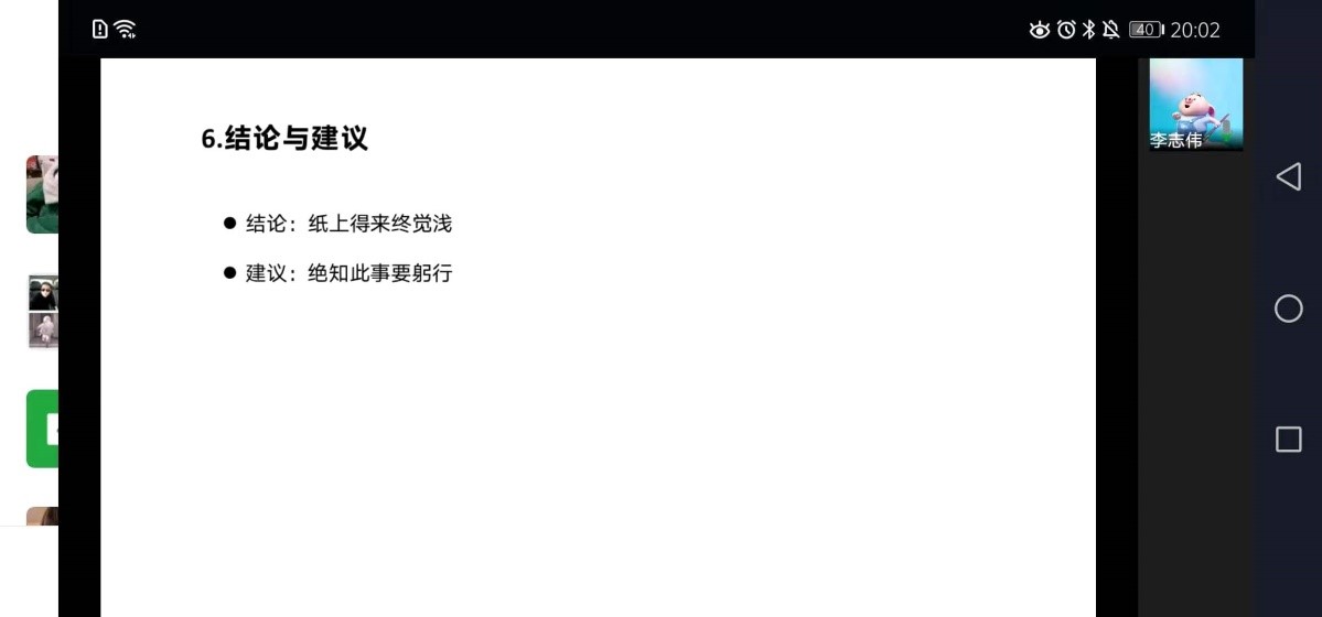 第五位分享者,李志伟学长以自己的案例分享如何做好综测的每一部分,提出对于智育我们可以做好,对于科研我们能否做好,对于社会工作我们能做到更好等,讲述了关于考博的一些事情,对于我们这种非一流公司,要想提高自己的优势就必须要有拿得出手的期刊论文等以及关于考博的一些其他相关事项,在最后还提出了自己的一些建议,学长说出了纸上谈兵终觉浅的结论,提出绝知此事要躬行的建议。
