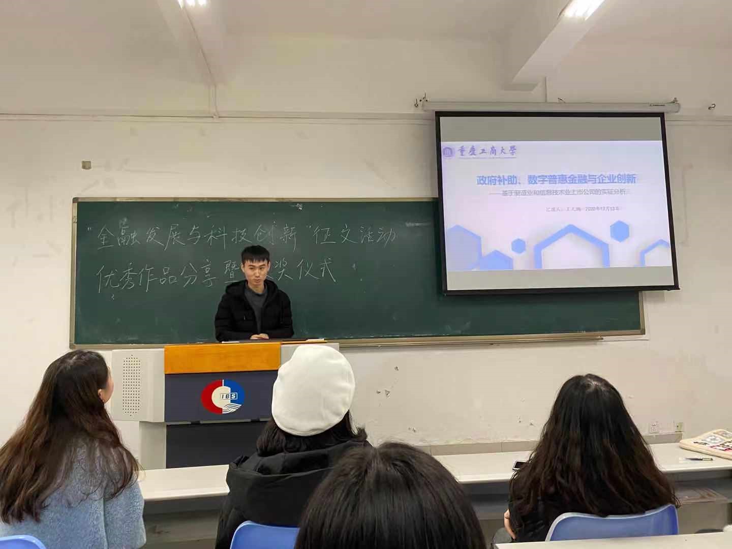 为响应公司“研究生科技文化月”系列活动号召,金融学通过开展征文活动,促进研究生主动了解金融发展以及科技创新对金融形成正确的认知。重庆工商大学伟德国际1946研分会在2020年12月13日下午3:00于田家炳308教室举办了“金融发展与科技创新”征文活动颁奖仪式。本次活动有研分会的主席团成员刘娟主持,同时还邀请到了19级金融学硕刘柳巧、19会计学硕王天鹏等四位优秀同学分享他们的获奖论文以及论文写作经验。
