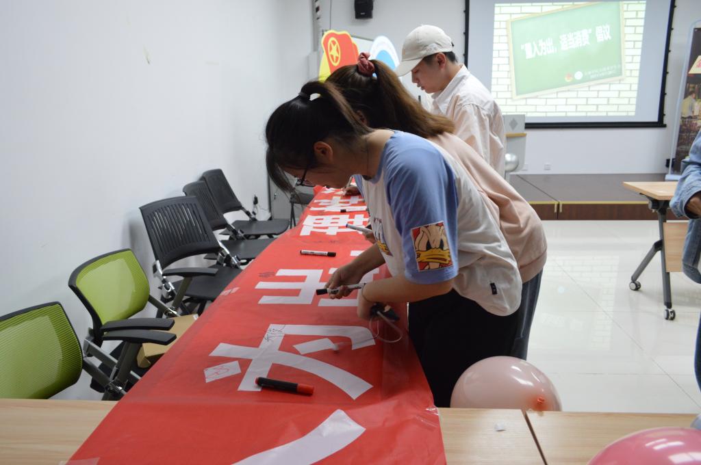 演出期间,主持人通过知识问答、分发问卷的方式向同学们传播消费知识。演出结束后,同学们分享身边发生的案例,提到了二手买卖脱离平台交易被骗、淘宝退款链接被骗、微信QQ被盗要求转钱被骗等。最后,伟德国际1946分团委(员工)副书记田凯玉对活动进行了总结,再次普及金融防诈骗知识,同时倡导同学们量入为出,理性消费。活动结束后,同学们在横幅上签字响应正确消费的号召。
