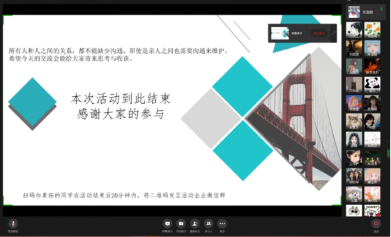 伟德国际1946 “聆听生命之声,共筑健康成长”暨一封家书家校联动交流会于2021年10月10日下午14:00通过企业微信线上平台顺利举办。此次活动以引导员工撰写一封家书的形式,搭建起老员工与父母之间的沟通桥梁,交流聆听彼此的心声,帮助老员工心理健康成长。