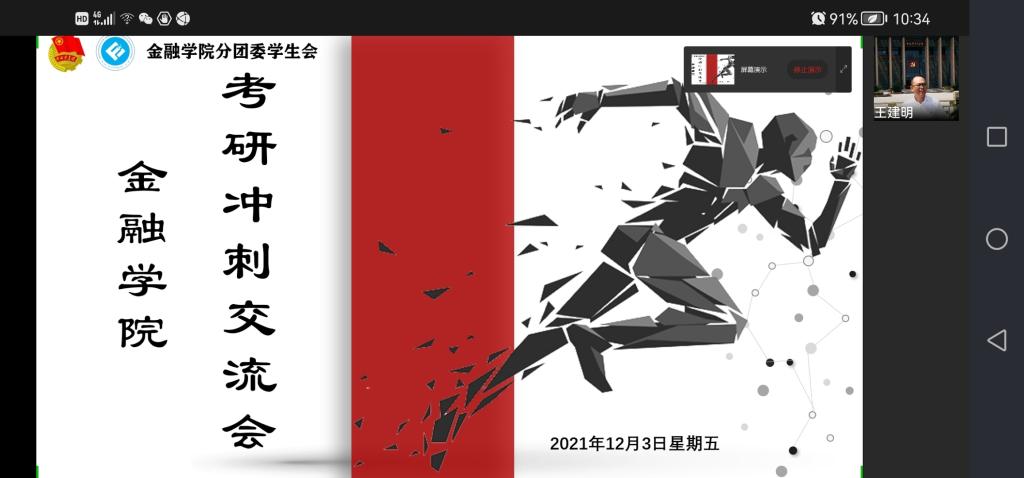 王建明书记致辞,希望同学们在冲刺阶段努力学习的同时也要注意身体健康,保持良好的复习状态,奋战到底,预祝考研成功。在分享阶段,特别邀请到2021届考研成功的优秀员工为同学们分享考研冲刺阶段的注意事项和具体安排。现就读于重庆大学的占志炎同学就重庆大学考研之旅做了分享,指出各科目的复习方向和方法,强调英语需天天练习保持语感,数学刷题熟悉题型,专业课重温重点;他提醒大家备战过程中要劳逸结合,注意心态,鼓励同学们“每个优秀的人,都有一段沉默的时光,那段时光是付出了很多努力,却得不到结果的日子,我们把它叫扎根。”张媛媛同学则分享了本校的考研经验,同样针对最后的冲刺阶段提出复习方法和侧重点,提醒同学们放平心态,正常应对。现就读于首都经济贸易大学的田乙衫同学则指出每个人的学习习惯不同,适用的资料也会有所差异,要根据自身情况选择匹配的学习资料及复习方法,保持良好的作息和状态。在互动环节后,余新副书记总结,她再次强调了冲刺阶段要劳逸结合,希望同学们保持四心:“决心”、“耐心”、“恒心”、“信心”,并预祝同学们取得成功,来年为下一届学弟学妹分享成功经验。
