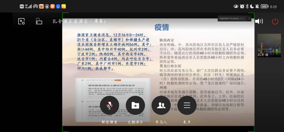 会上,孔令旗介绍了全国疫情形势总体状况以及感染症状。他着重讲解感染病毒后常见体征有呼吸道症状、发热、咳嗽、气促和呼吸困难等,在较严重病例中,感染可导致肺炎、严重急性呼吸综合征、肾衰竭,甚至死亡。同时,孔令旗就2021年11月9日南非首次检测到的新型冠状病毒变种奥密克戎进行介绍,并表示,据英国卫生安全局16日公布的数据显示,该变异病毒在英国的感染速度仍在不断增加。孔令旗还提到,在抗击疫情中,涌现出了许多人民英雄。如武昌医院经理刘志明、钟南山院士、“火神山的摆渡人”庞益兵、火神山护士吴亚玲……他们救人民于水火,解百姓于倒悬,在新冠疫情这场没有硝烟的战争中奋不顾身,满腔责任为国为民。