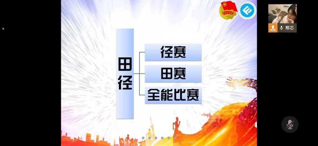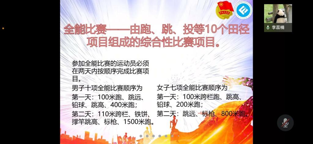 熊芯首先介绍了径赛的基本含义,分类说明了短距离跑类、中距离跑类、长距离跑类、跨栏跑类、接力跑类、障碍跑类和竞走类7大种类径赛及18个运动项目。接着强调接力比赛的规则及细节,包括起跑以后不可以穿道、必须在接棒区内完成交接棒等。随后,石冠禹对跳和掷两类田赛进行讲解,其中“跳”包括跳高、跳远、三级跳远、撑杆跳高,“掷”则包括铅球、铁饼、标枪、链球。接着对跳、掷比赛的规则和测量方法进行了细节描述。而后李蕊楠详细描述了全能比赛的相关内容,它包括跑、跳、投等10个田径项目组成的综合性比赛项目,参加全能比赛的运动员必须在两天内按顺序完成比赛项目,其中男生需完成十项,女生则需完成七项。