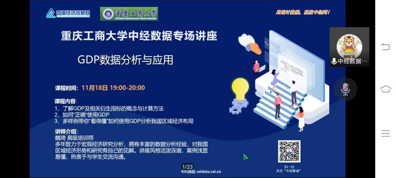 2022年11月18日19:00,伟德国际1946联合图书馆在线上开展“GDP数据分析与应用——助你‘看得懂’我国区域经济布局”专题讲座。本次讲座邀请了中国经济信息网张玥老师和魏琦老师主讲,旨在介绍GDP数据分析与应用,带领同学们了解GDP及相关衍生指标的概念及计算方法。