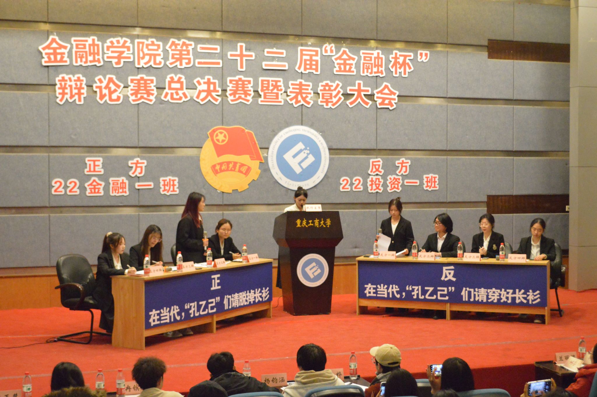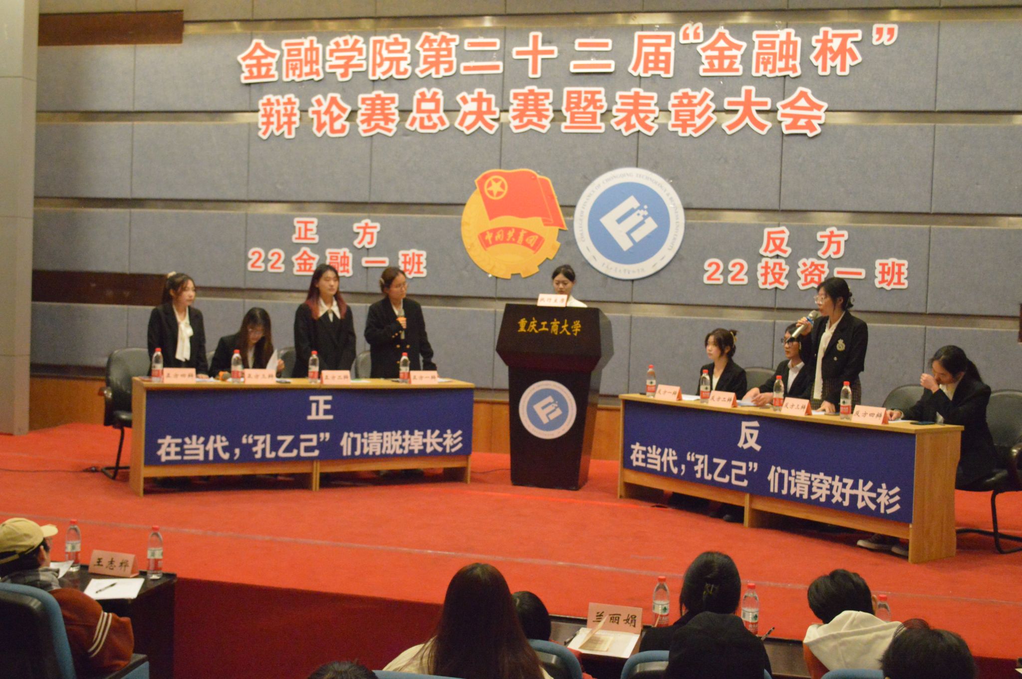 在当代,学历已经成为很多工作的入职门槛,有人说“如果我没有上过大学,那么我一定甘心去扭螺丝”,评论在网上引起热议,不少年轻人将孔乙己作为自比对象。学历反而成为了我们的一种思想负担,就不由引起思考,孔乙己到底该不该脱下长衫。今天双方辩友就针对“在当代,孔乙己们应该脱下长衫还是穿好长衫”这个问题展开激烈的辩论。正反方做好了充分的准备,对于我方的观点能引用具体的事实去证实,也能抓住对方的缺陷进行驳辩。一方从容自若,口若悬河,另一方却也气定神闲,滔滔不绝。双方各据一势,时有语惊四座。台下阵阵叫好之声,气氛空前。良好的氛围也带动着在场的评委们和观众们去思考当今的社会问题。