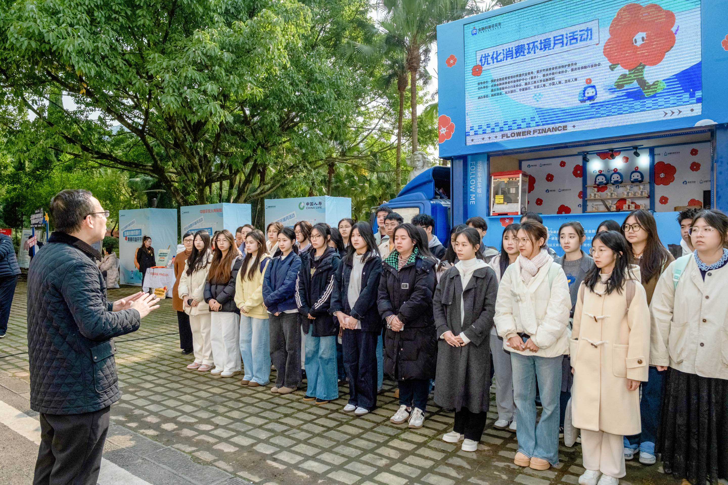 “金融科普花花车”为本次活动的核心载体,车内配置高清大屏,循环播放防范非法集资、校园贷陷阱等宣传片,车身张贴着有关征信、反诈、反洗钱与非法集资的宣传页。它既是流动的金融教育基地,也是重庆金融机构践行金融科普责任的公益开放平台。