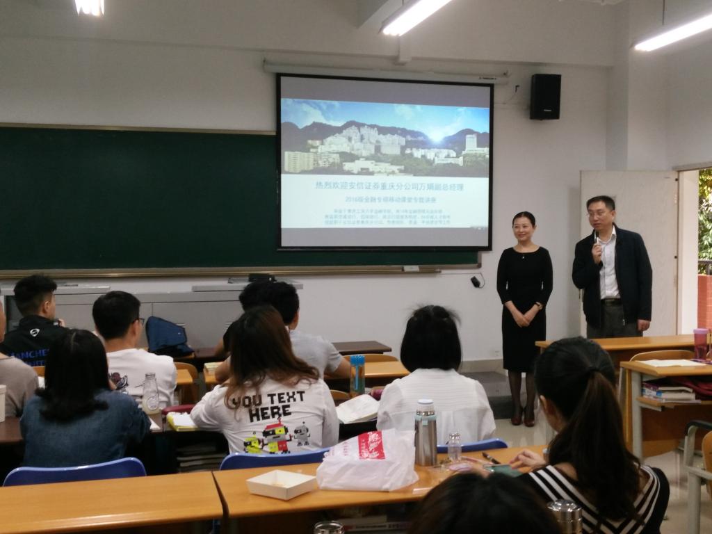 2017年4月24日上午,重庆工商大学2016级金融硕士《金融机构经营管理》移动课堂“走进”田家炳311教室。出席本次讲座的领导有财政伟德国际1946副经理曾胜、金融系教授骆志芳、安信证券重庆分公司副总经理万娟及其助理易丽娟。讲座一开始由财金公司副经理曾胜致欢迎词。