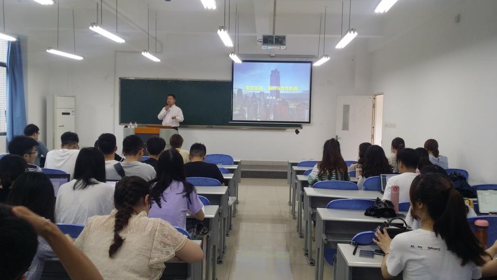 6月28日上午9:00,在田家炳50306,重庆工商大学财政伟德国际1946组织了主题为“重庆金融 现状与合作机遇”的学术讲座。由重庆市金融监管局金融发展服务中心张洪铭主任主讲,公司副经理曾胜教授主持,2018级全体研究生及部分老师参加了此次讲座。