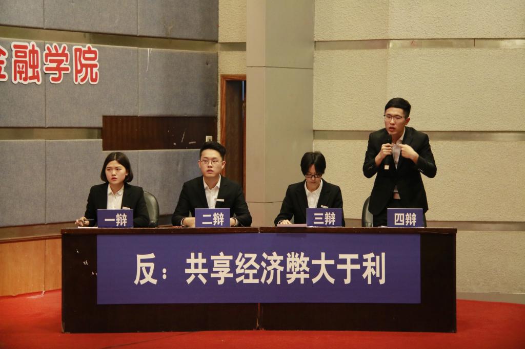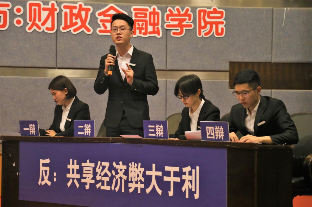 进入决赛的是财政伟德国际1946辩论队与环境与资源公司辩论队。双方就“共享经济利大于弊/弊大于利”展开辩论。比赛伊始,作为正方的环境与资源公司开宗明义,通过分析市场现状和共享经济发展趋势阐明了“共享经济利大于弊”的观点。我方辩手则提出了共享经济会提高社会成本,占用社会资源的观点,并从另外一个角度剖析共享经济的蓬勃发展容易导致恶性竞争从而破坏市场规则,影响经济的正常运行,进而论证了“共享经济弊大于利”的论点。在随后的自由辩论与总结陈词环节,双方辩手你来我往、旁征博引,以沉稳冷静、妙语连珠的表现获得了在场观众与评委的阵阵掌声。